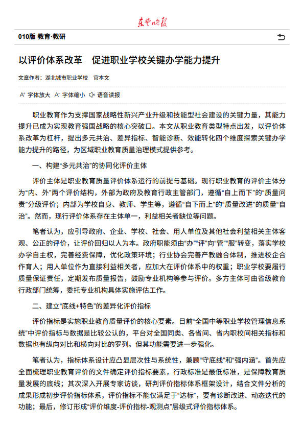 东楚晚报 : 以评价体系改革 促进职业学校关键办学能力提升